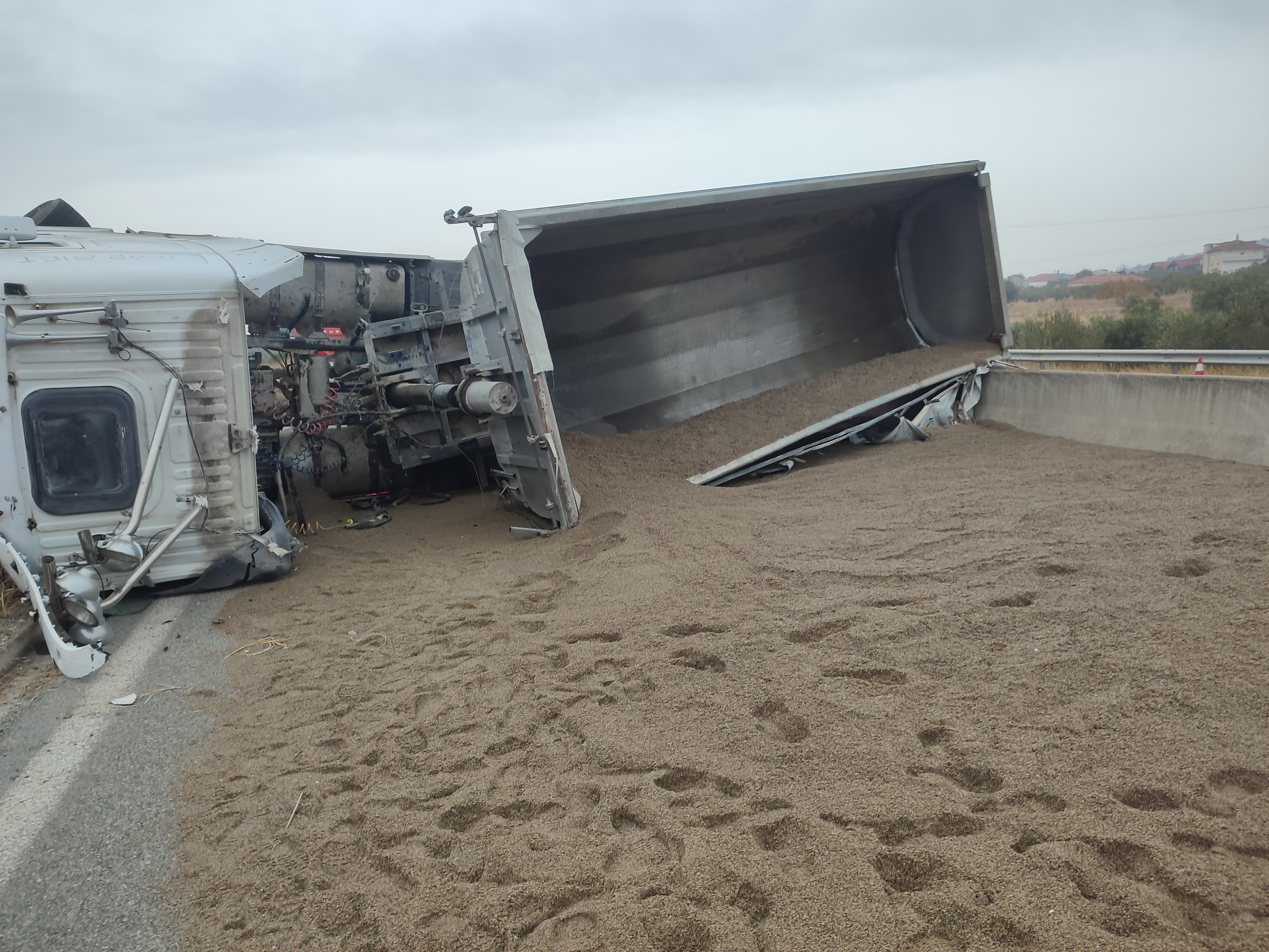 Σύμφωνα με τις πληροφορίες μας , ο οδηγός της προπορευόμενης νταλίκας σταμάτησε απότομα για να συνομιλήσει με συνάδελφο του απο την άλλη πλευρά του δρόμου που είχε σταματήσει λόγω βλάβης. Το φορτηγό φορτωμένο άμμο που ακολουθούσε την τελευταία στιγμή για να αποφύγει την σύγκρουση προσπάθησε να προσπεράσει την νταλίκα, την χτύπησε στην πίσω άκρη και ανατράπηκε κάθετα στον δρόμο.