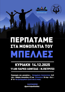 ▪️Στο πνεύμα αυτής της ημέρας, ο Πολιτιστικός Φυσιολατρικός Σύλλογος Νέου Πετριτσίου διοργανώνει μια ιδιαίτερη πεζοπορική εκδήλωση την Κυριακή 14 Δεκεμβρίου 2025, στα μαγευτικά μονοπάτια του βουνού Μπέλλες.