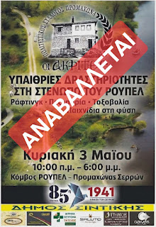 η εκδήλωση του συλλόγου μας “Υπαίθριες δραστηριότητες στη Στενωπο Ρούπελ ” δεν θα πραγματοποιηθεί στον Μήνα των Οχυρων, όπως είχε προγραμματιστεί να γίνει στις 3 Μαΐου. Το διοικητικό συμβούλιο ειναι καλεσμένο σε ένα κοινωνικό γεγονός που θα λάβει χώρα στο χωριο μας την ίδια ημερομηνία της εκδήλωσης και οφείλουμε να παρευρεθουμε εκει. Σύντομα θα ανακοινωθεί νέα ημερομηνία.