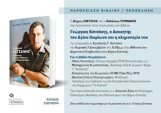 Ο Δήμος Σιντικής και οι εκδόσεις Γερμανός θα παρουσιάσουν το  βιβλίο « Γεώργιος Κατσάνης , ο Διοικητής του Αγίου Ιλαρίωνα και η κληρονομία του » της συγγραφέως Κατσάνη Αγγελικής, την Κυριακή 7 Δεκεμβρίου στην αίθουσα του Δημοτικού Συμβουλίου του Δήμου Σιντικής στις 5.30 το απόγευμα.