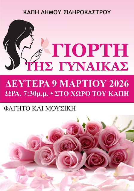 Με πολλή χαρά σας προσκαλούμε να γιορτάσουμε μαζί την Ημέρα της Γυναίκας στο ΚΑΠΗ Σιδηροκάστρου. Μια όμορφη βραδιά αφιερωμένη σε όλες τις γυναίκες της ζωής μας — στις μητέρες, στις γιαγιάδες, στις φίλες, στις αδερφές — που με την αγάπη, τη δύναμη και το χαμόγελό τους ομορφαίνουν τον κόσμο μας.