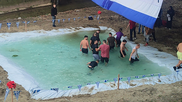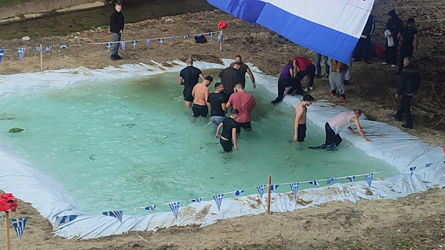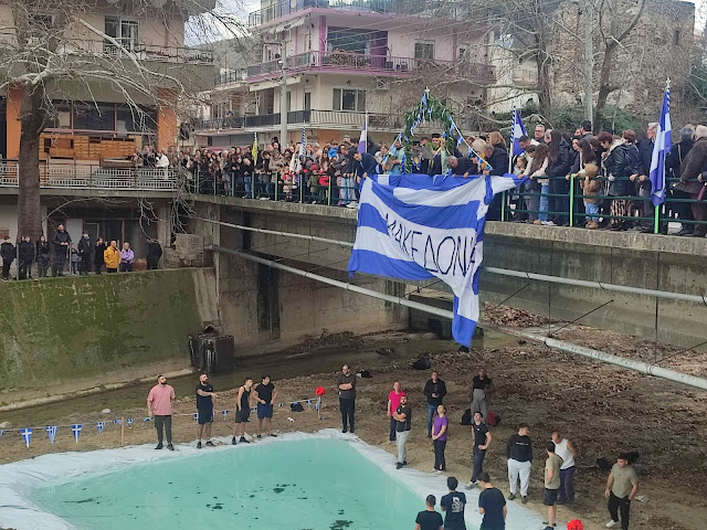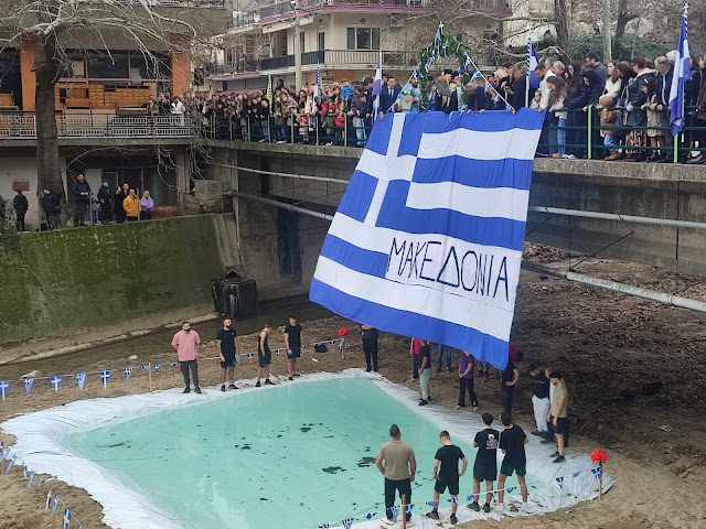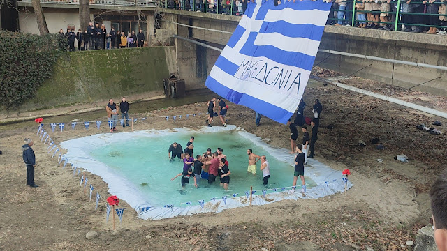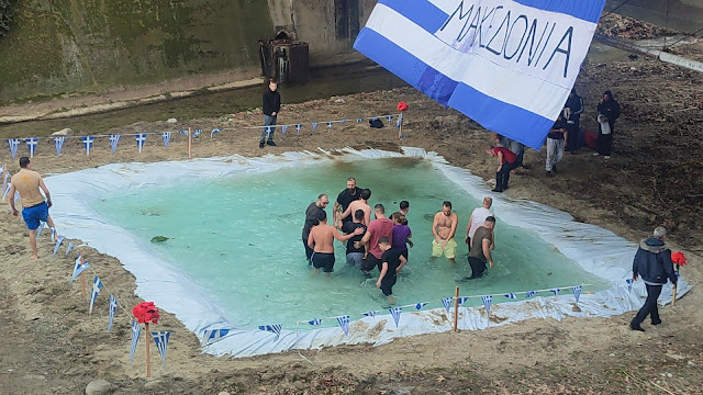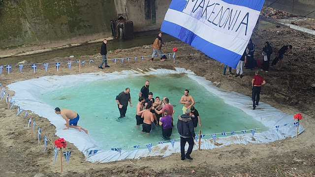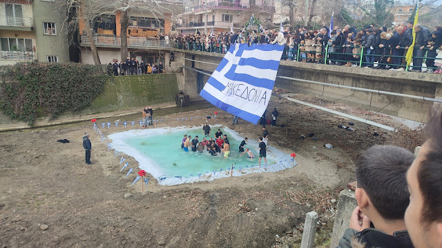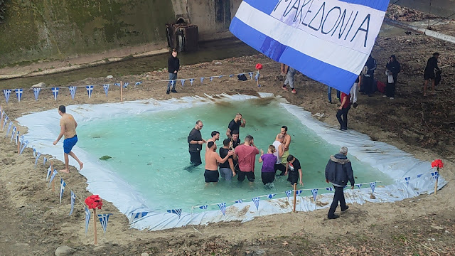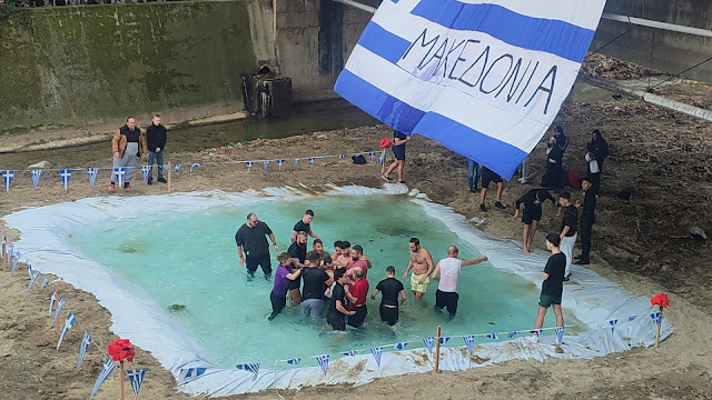 Κύρια χαρακτηριστικά των φετινών αγιασμών των υδάτων, μια τεράστια ελληνική σημαία που έγραφε Μακεδονία – προφανώς να μας θυμίζει που βρισκόμαστε , ισως να μην το γνώριζαν πολλοί – εν είδη υπερβολής , που θα μπορούσε να φτάσει εως και την πατριδοκαπηλεία.