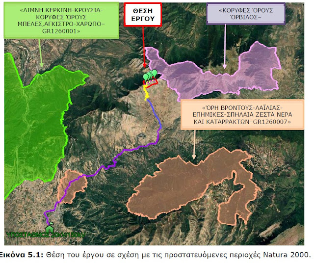 🔹Περαιτέρω, η ΜΠΕ παραδέχεται ότι τμήμα της διασυνδετικής γραμμής του έργου χωροθετείται εντός προστατευόμενης περιοχής Natura 2000, και συγκεκριμένα εντός της περιοχής με κωδικό GR1260007 «Όρη Βροντούς – Λαϊλιάς – Επημίκες – Σπήλαια Ζεστά Νερά και Καταρρακτών». Παρά τη σαφή αυτή παραδοχή, η παρουσίαση του έργου επιχειρεί να απομονώσει το αιολικό πάρκο από τα συνοδά του έργα, σαν να πρόκειται για ανεξάρτητες παρεμβάσεις. Στην πραγματικότητα, όμως, το έργο είναι ενιαίο και οι επιπτώσεις του αθροιστικές.