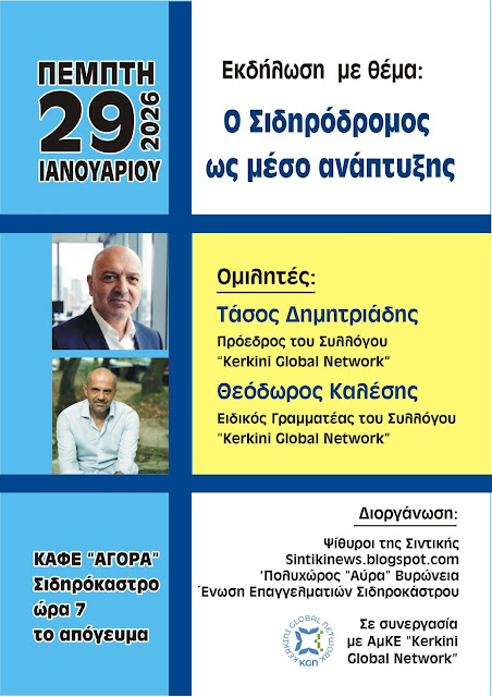 Με μεγάλη επιτυχία πραγματοποιήθηκε η εκδήλωση με θέμα «Ο Σιδηρόδρομος ως μέσο ανάπτυξης», την Πέμπτη 29 Ιανουαρίου 2026, στην κατάμεστη αίθουσα του καφέ «Αγορά» στο Σιδηρόκαστρο. Ομιλητές ήταν οι κ.κ. Τάσος Δημητριάδης και Θεόδωρος Καλέσης, πρόεδρος και ειδικός γραμματέας αντίστοιχα του Συλλόγου «KerkiniGlobalNetwork».