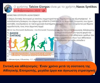 Με άλλα λόγια, υπάρχουν και τα δεδομένα και τα θεσμικά εργαλεία. Αυτό που λείπει είναι η επιλογή να αξιοποιηθούν. Έτσι, αντί για μια στρατηγική αναγέννηση του αθλητισμού από τη βάση, η δημοτική αρχή φαίνεται να δίνει προτεραιότητα στην κατασκευή νέων έργων πολλών εκατομμυρίων. Και ενώ ανακοινώνονται πόροι σε νέες υποδομές, στα ακριτικά χωριά του Δήμου μας δημότες εξακολουθούν να πληρώνουν από το προσωπικό τους εισόδημα για μια βασική ώρα άσκησης την εβδομάδα, την ίδια στιγμή που σε άλλους Δήμους η ίδια ανάγκη καλύπτεται θεσμικά και οργανωμένα.