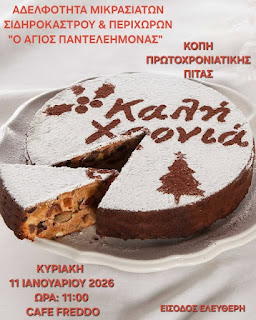 Η Αδελφότητα Μικρασιατών Σιδηροκάστρου και περιχώρων “Ο Άγιος Παντελεήμονας” θα πραγματοποιήσει την κοπή της Πρωτοχρονιάτικης πίτας την Κυριακή 11 Ιανουαρίου 2026 και ώρα 11:00 στο CAFE FREDDO στο Σιδηρόκαστρο.