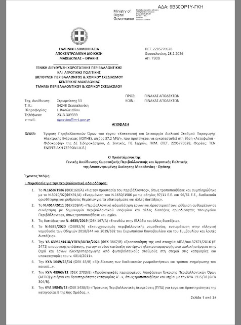 Χθες δυστυχώς αναρτήθηκε στη Διαύγεια ακόμη μια έγκριση Περιβαλλοντικών όρων.